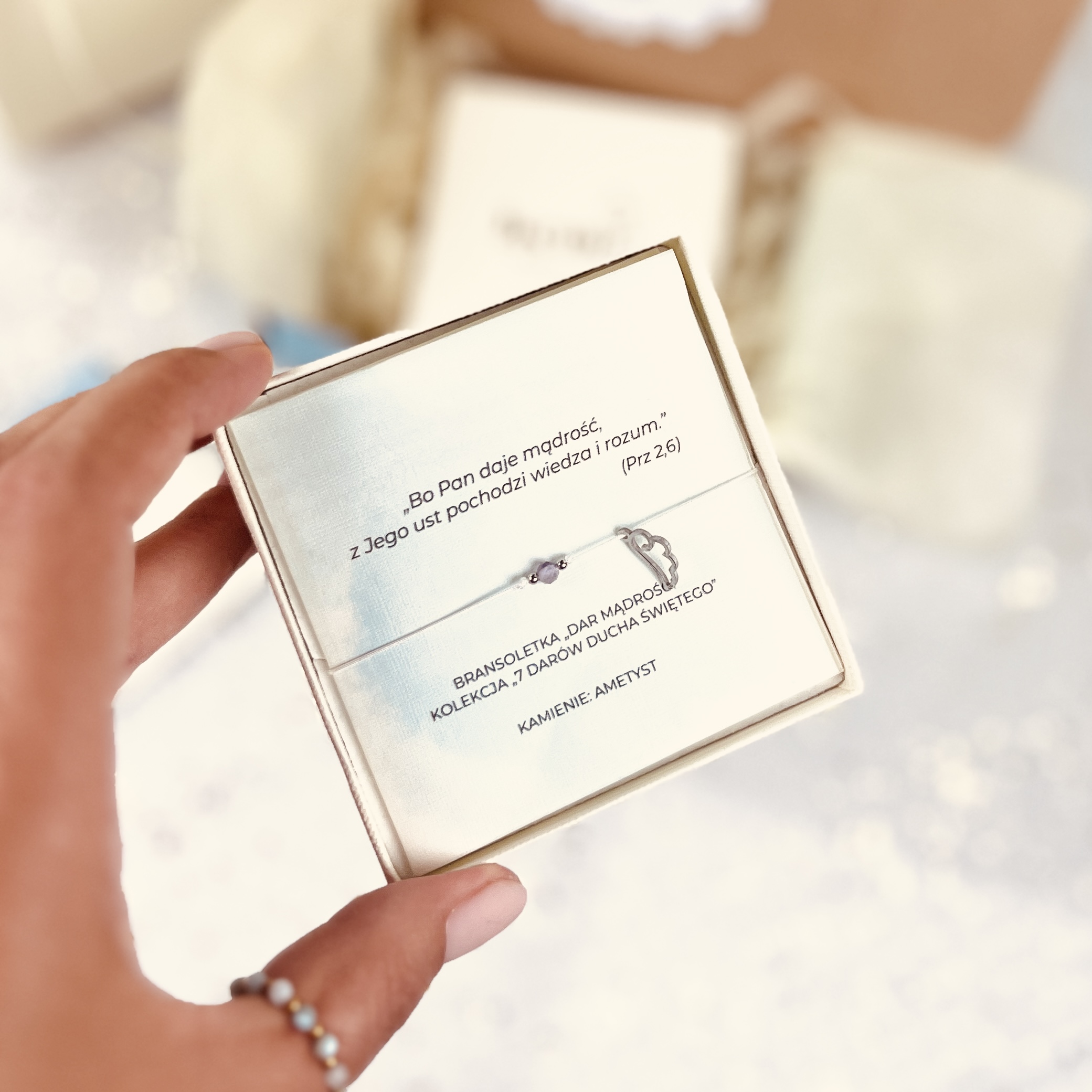 Otrzymasz ją w eleganckim pudełeczku z personalizowaną kartką i cytatem biblijnym.
