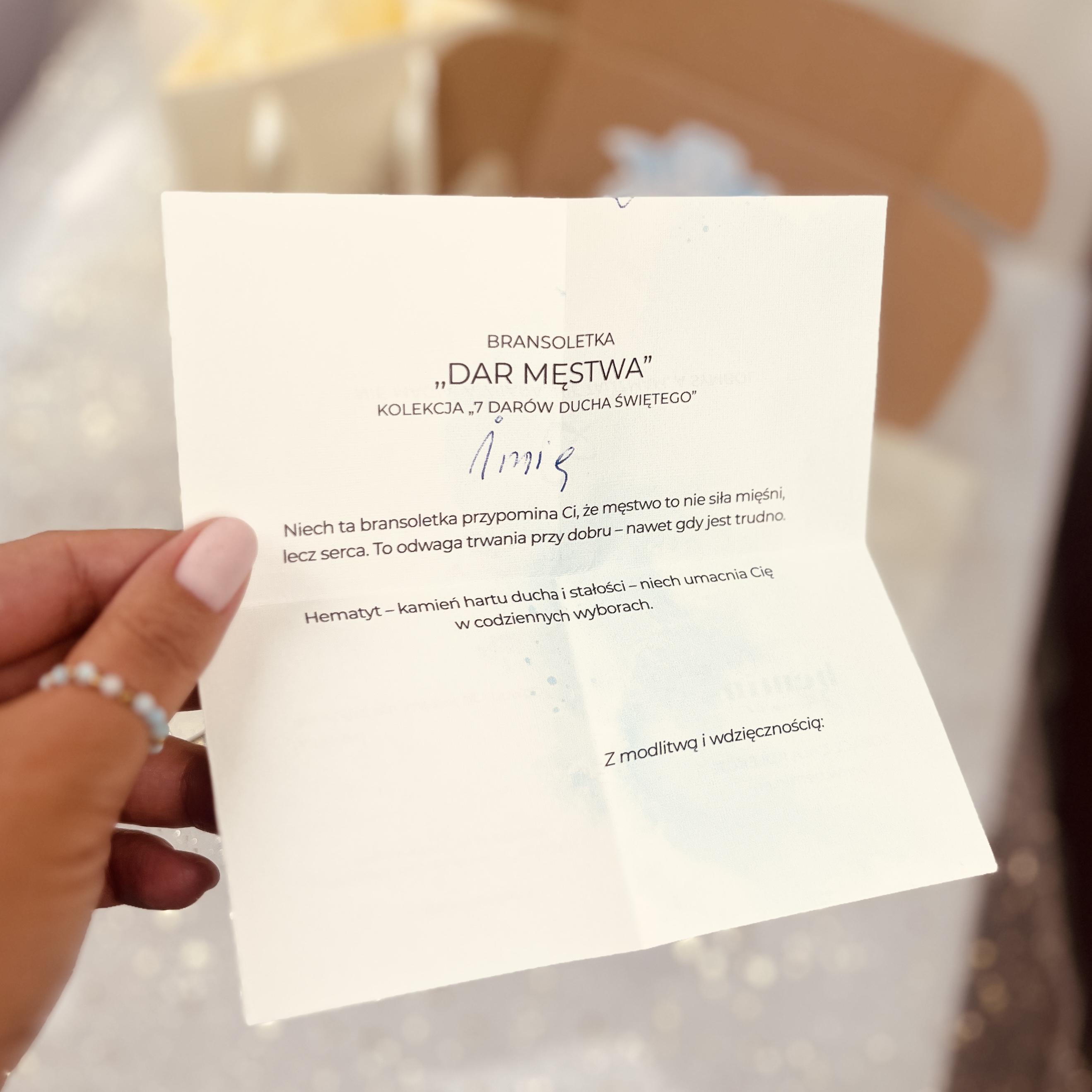 Otrzymasz ją w eleganckim pudełeczku z personalizowaną kartką i cytatem biblijnym.