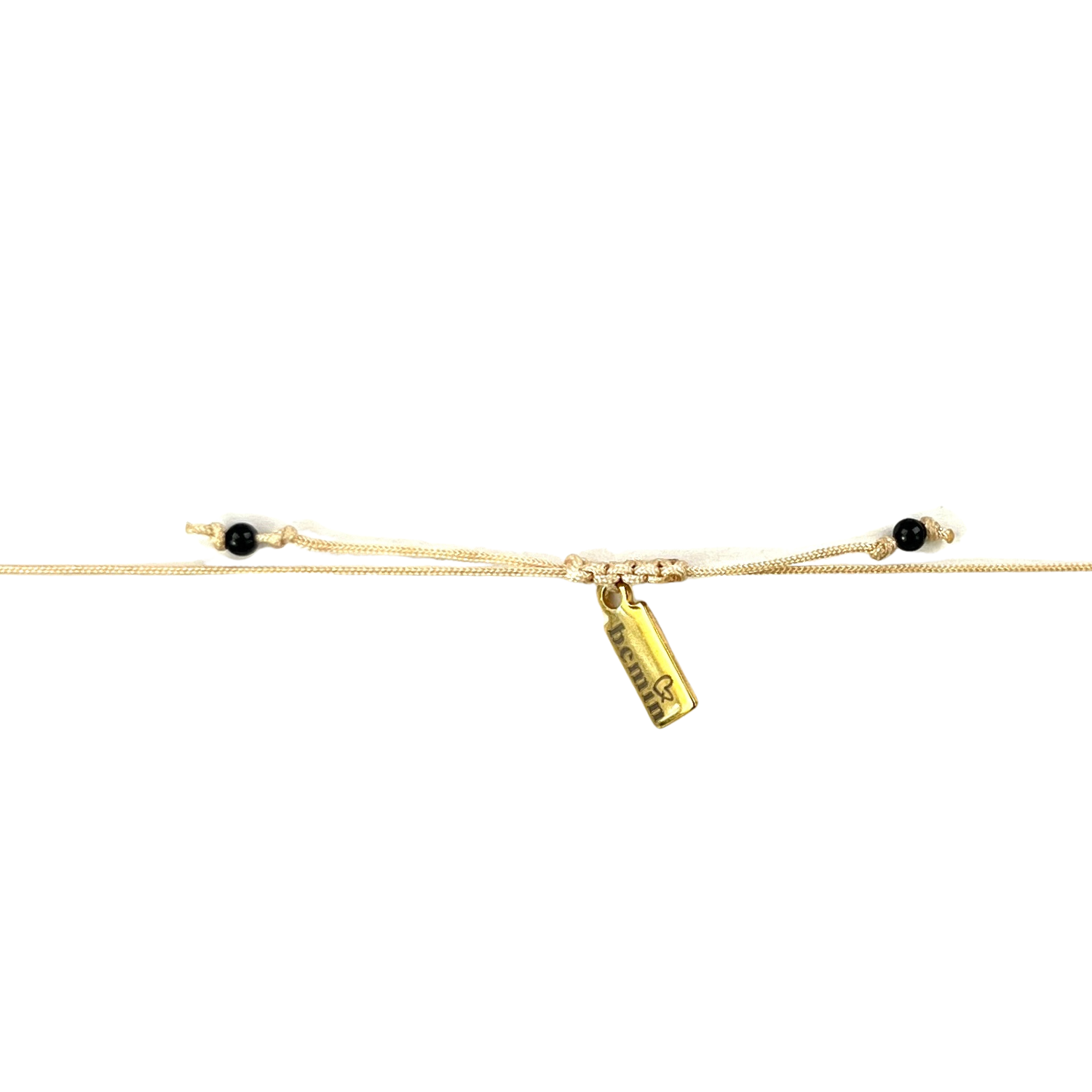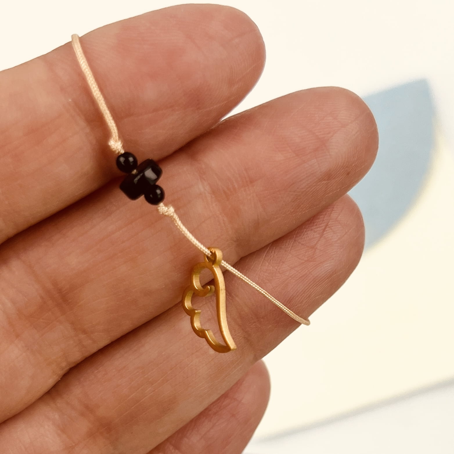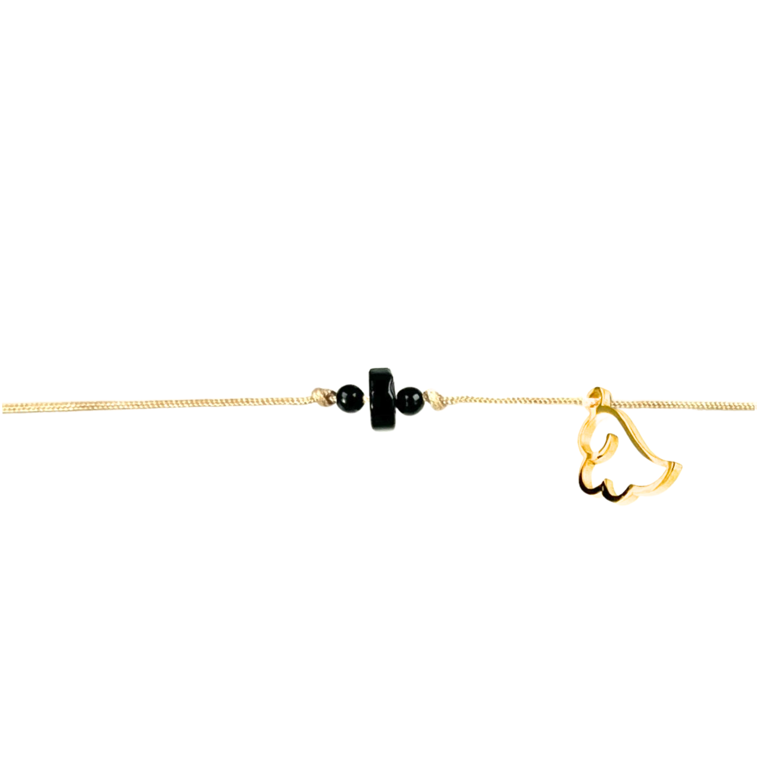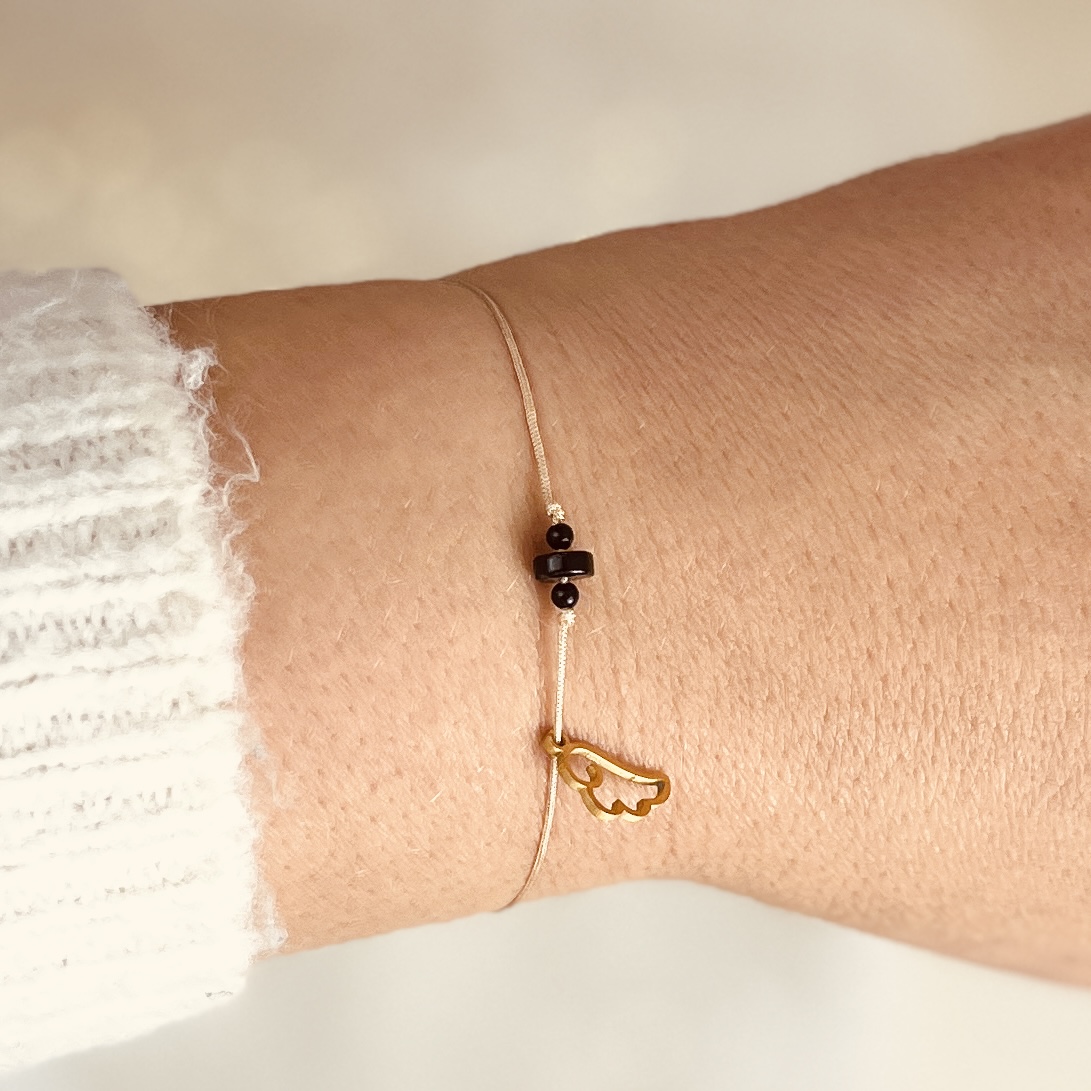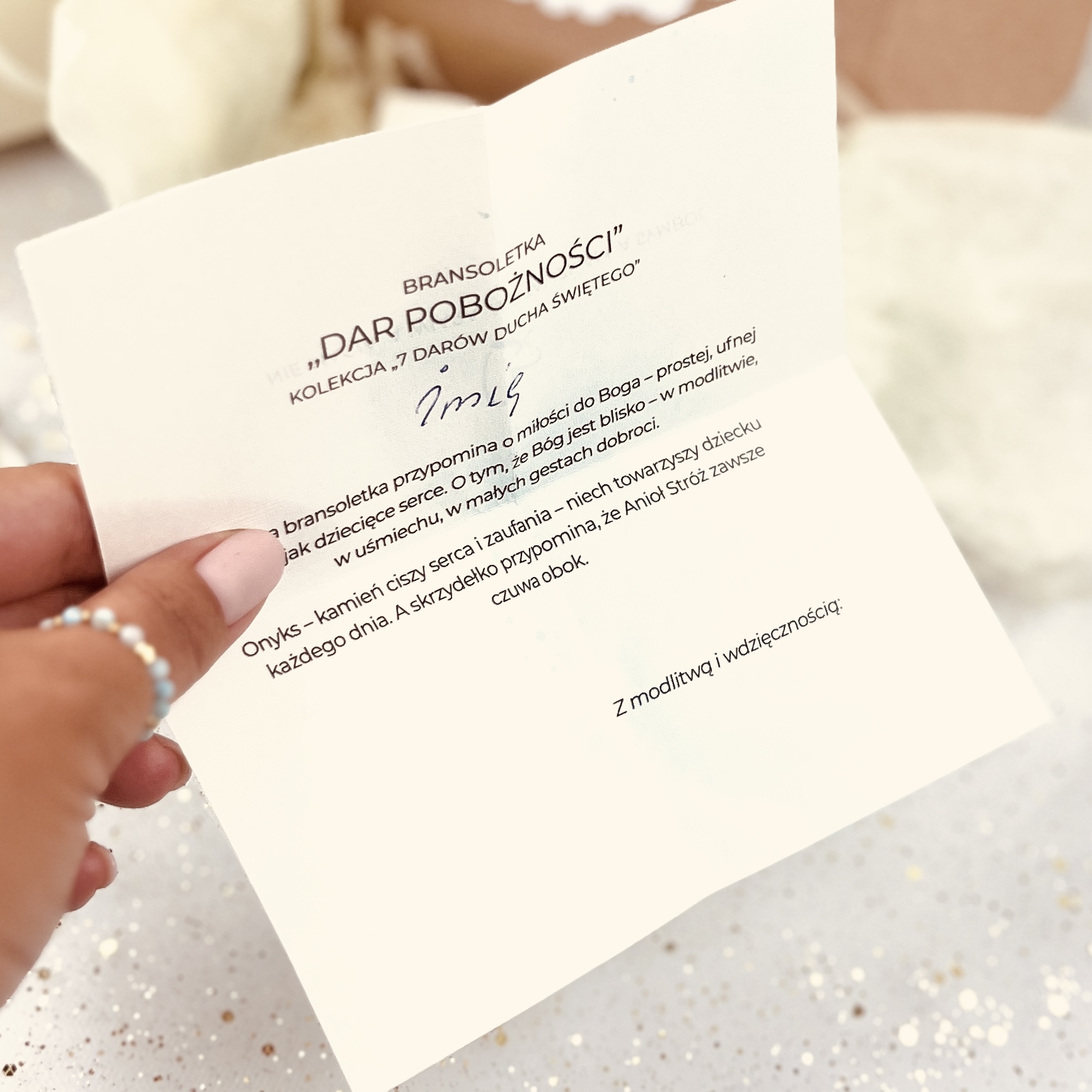 Subtelne zestawienie form — talarek onyksu i drobne kulki — tworzy rytmiczną kompozycję, która symbolizuje modlitwę, wierność i wewnętrzną harmonię. Delikatna zawieszka w kształcie skrzydełka przypomina o Bożej opiece i cichej obecności, która towarzyszy każdego dnia.