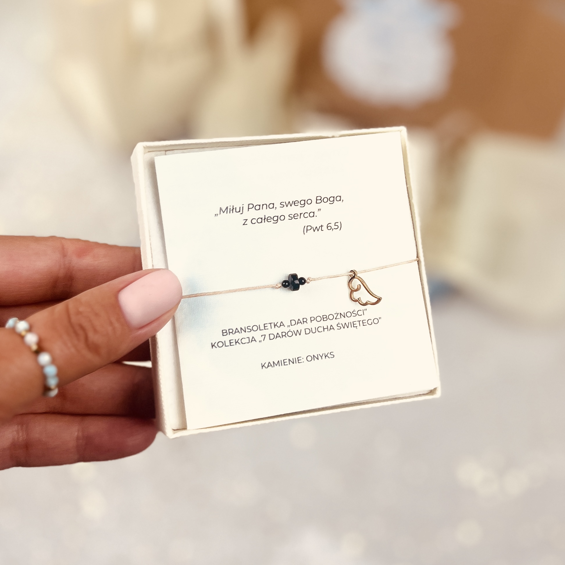 Ta bransoletka religijna dla kobiety powstała jako symbol właśnie takiej relacji. Wykonana z czarnego onyksu — kamienia pokory, skupienia i ciszy serca — przypomina, że to, co najważniejsze, rodzi się w wnętrzu człowieka.