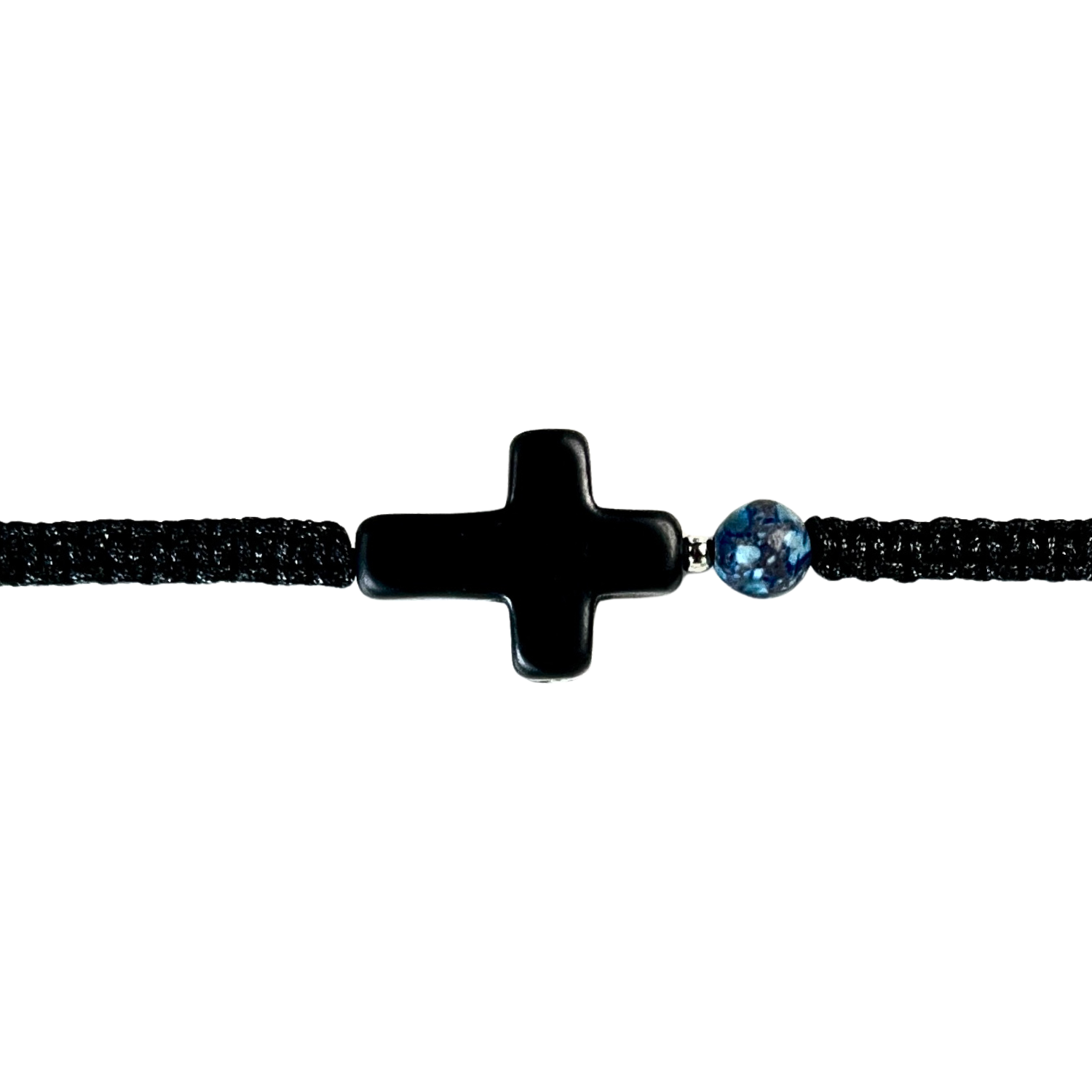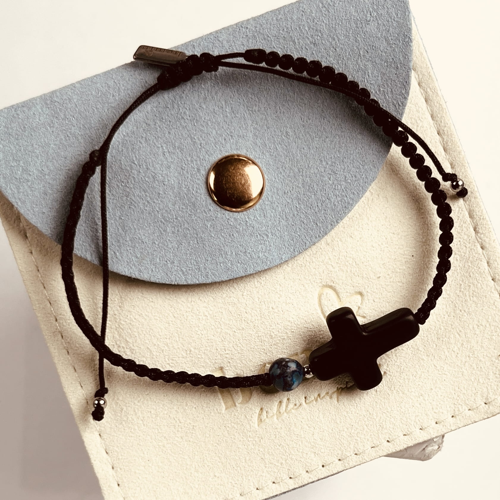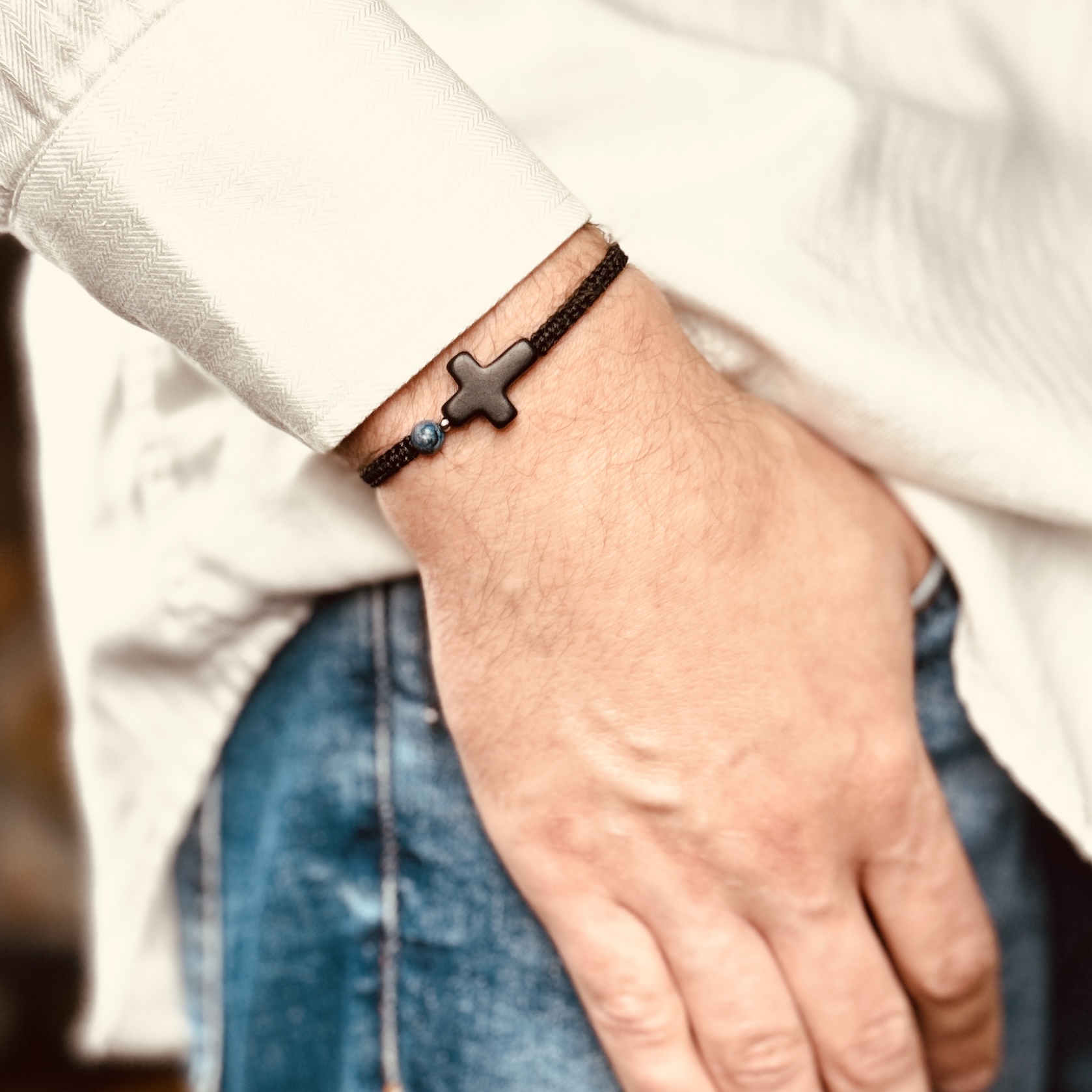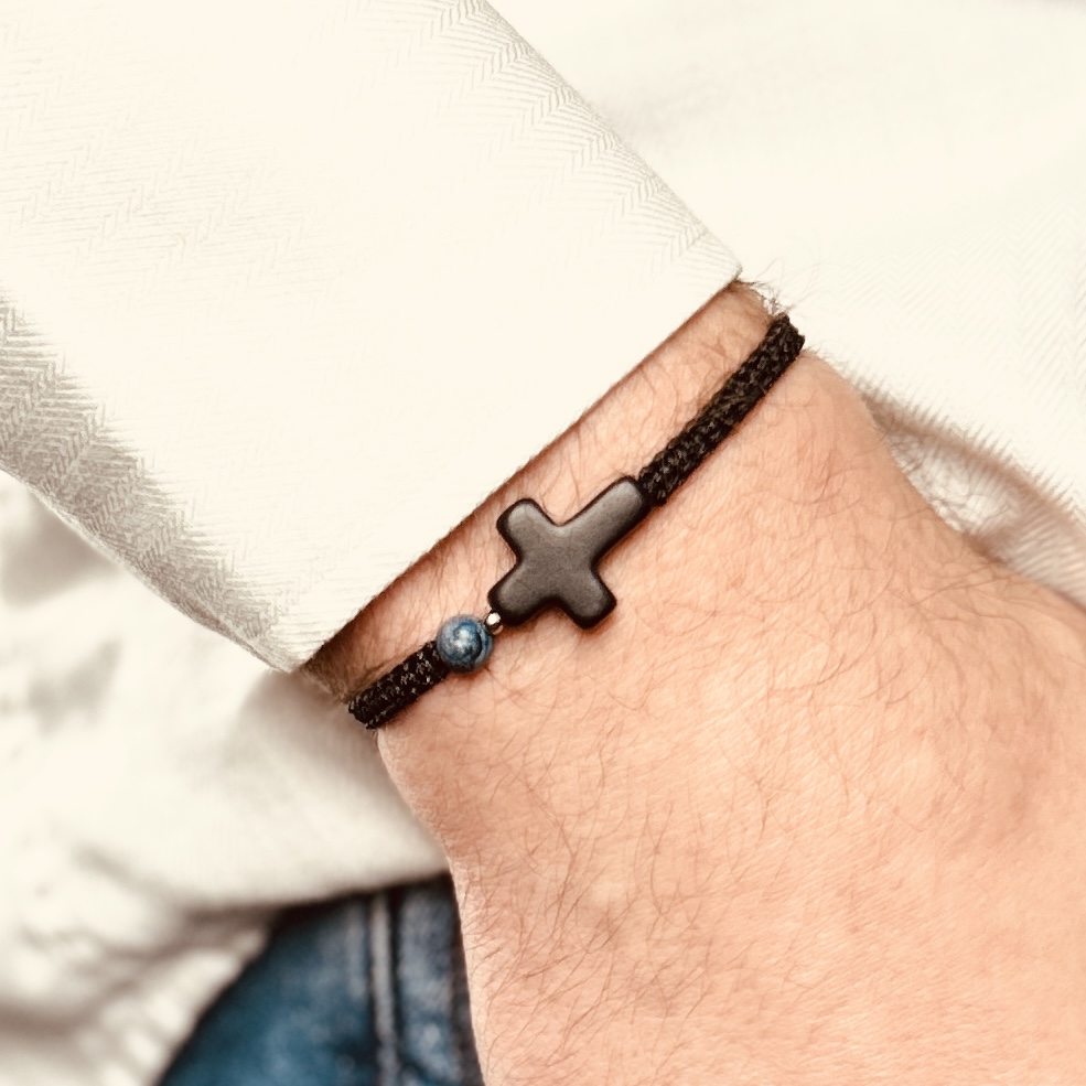 Całość dopełnia krzyż z czarnego howlitu — stały element wszystkich męskich bransoletek chrześcijańskich z tej kolekcji. To prosty, a zarazem mocny znak wiary i przynależności do Chrystusa.