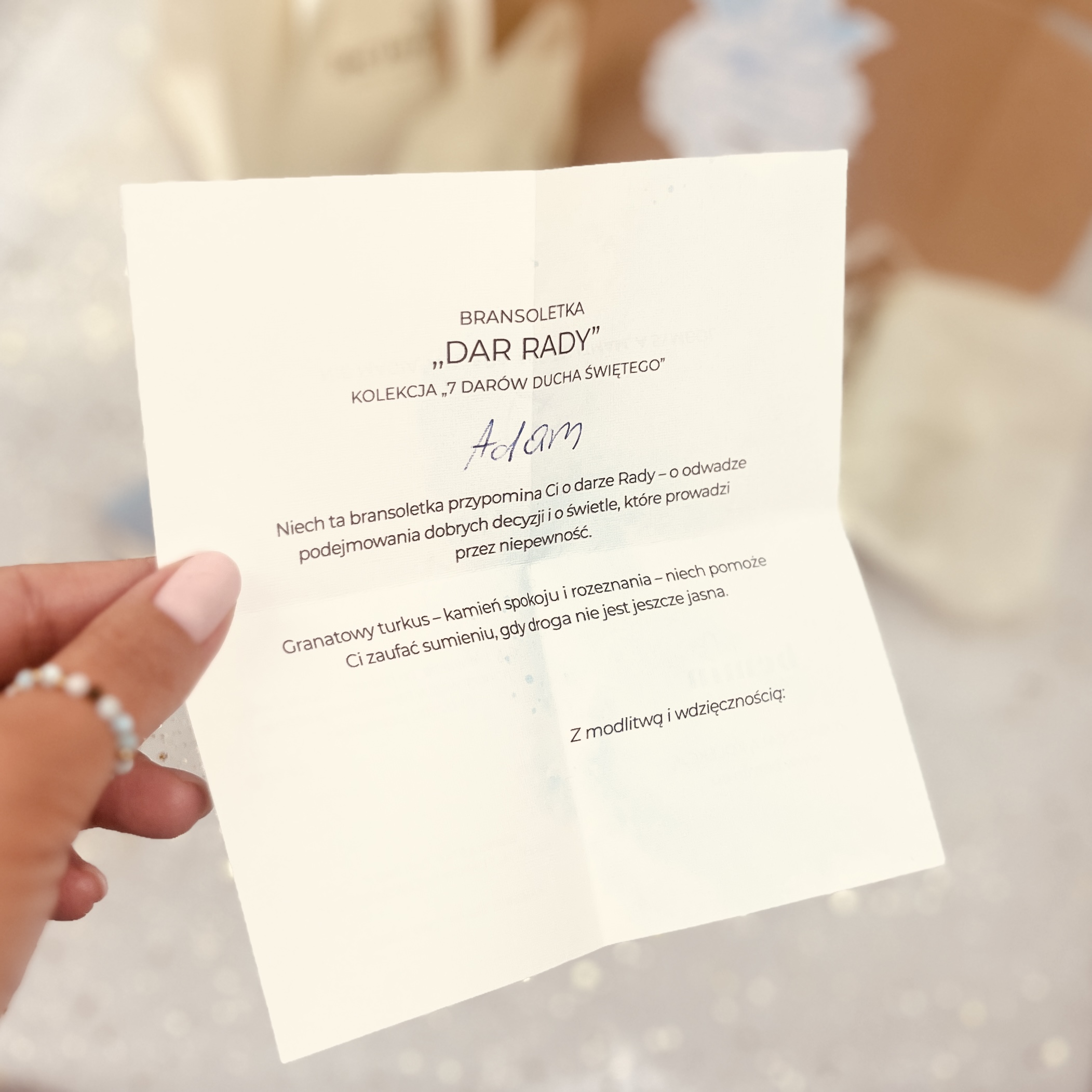 Otrzymasz ją w eleganckim pudełeczku z personalizowaną kartką i cytatem biblijnym.