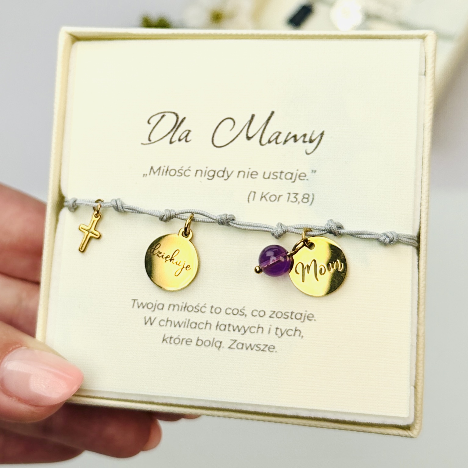 Zawieszka z napisem „Mom” nadaje bransoletce osobisty i wyjątkowy charakter — może być pięknym symbolem miłości, relacji i wdzięczności wobec mamy. Całość dopełnia krzyżyk ze stali szlachetnej, który wyznacza początek modlitwy i przypomina, że każdy dzień warto zaczynać od Boga.