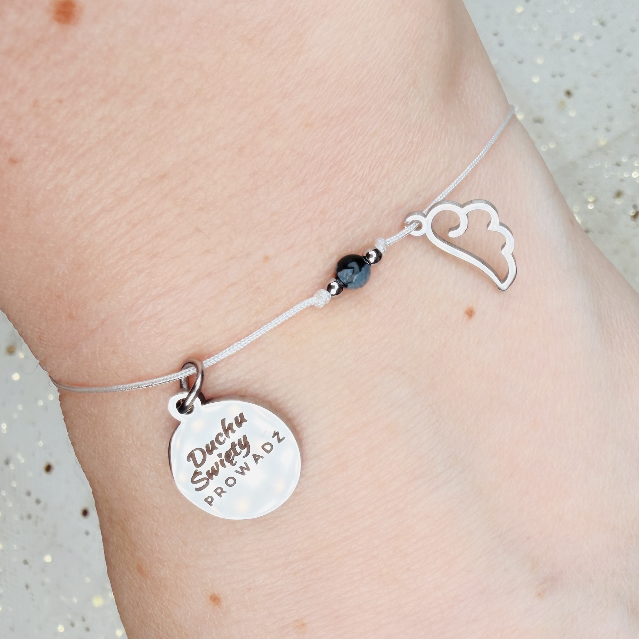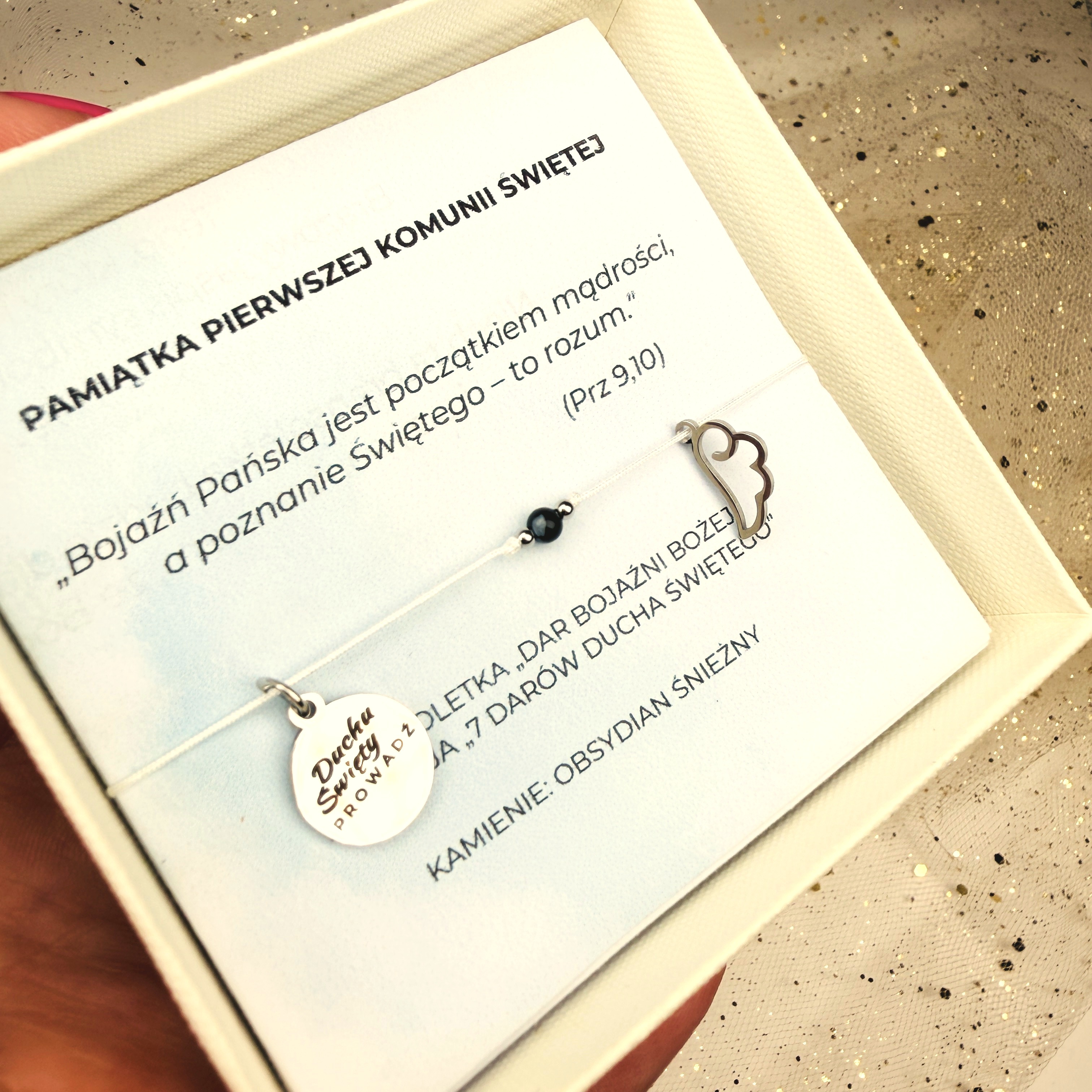 Szczególnym elementem bransoletki jest blaszka z grawerem „Duchu Święty, prowadź” — krótką modlitwą, która oddaje sens Daru Bojaźni Bożej i może towarzyszyć dziecku każdego dnia.