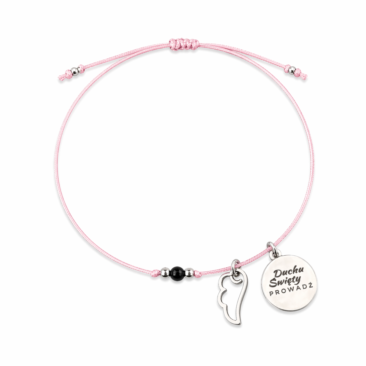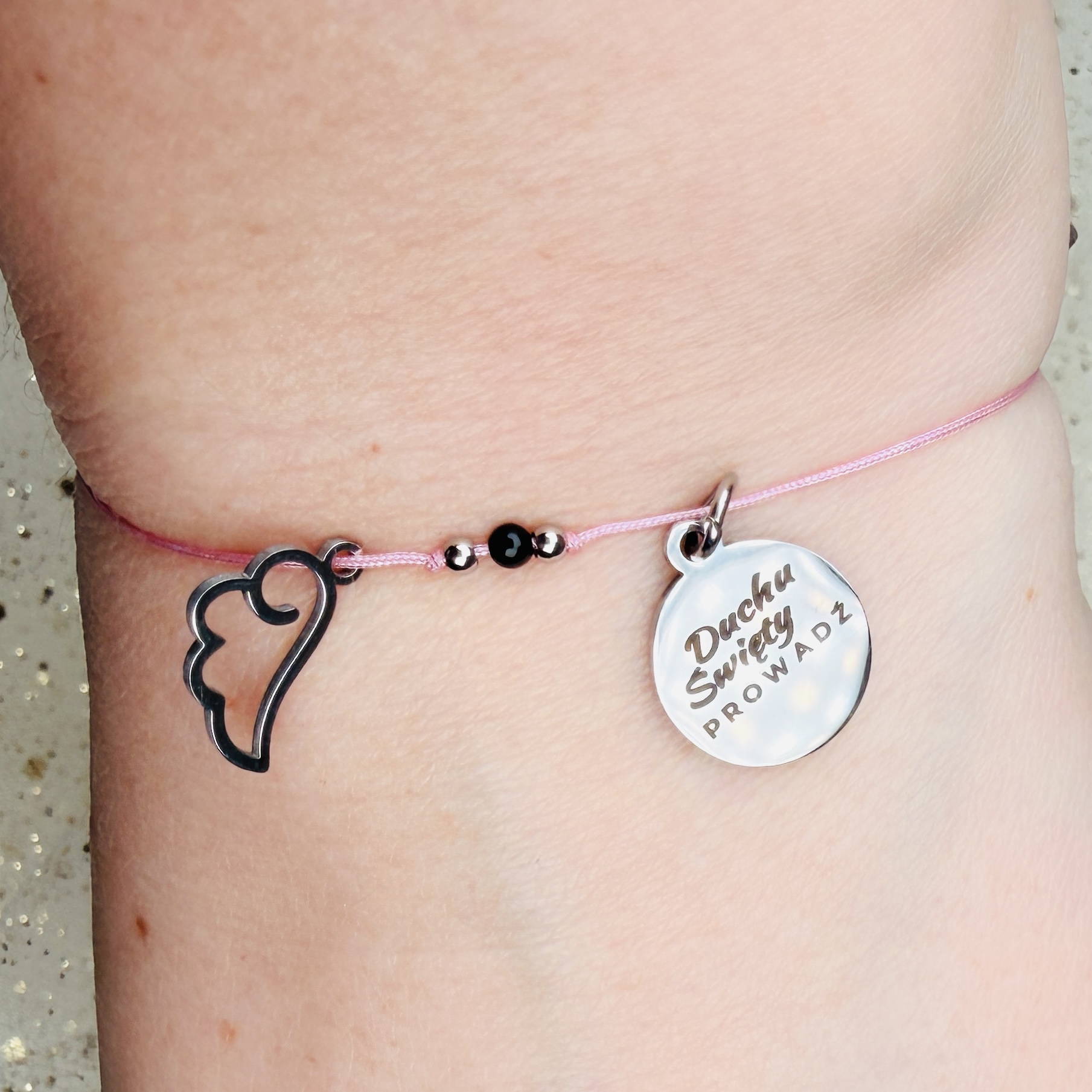 Delikatny różowy sznureczek nadaje bransoletce dziewczęcej lekkości i subtelności — jest wygodna, miękka i idealna do codziennego noszenia.