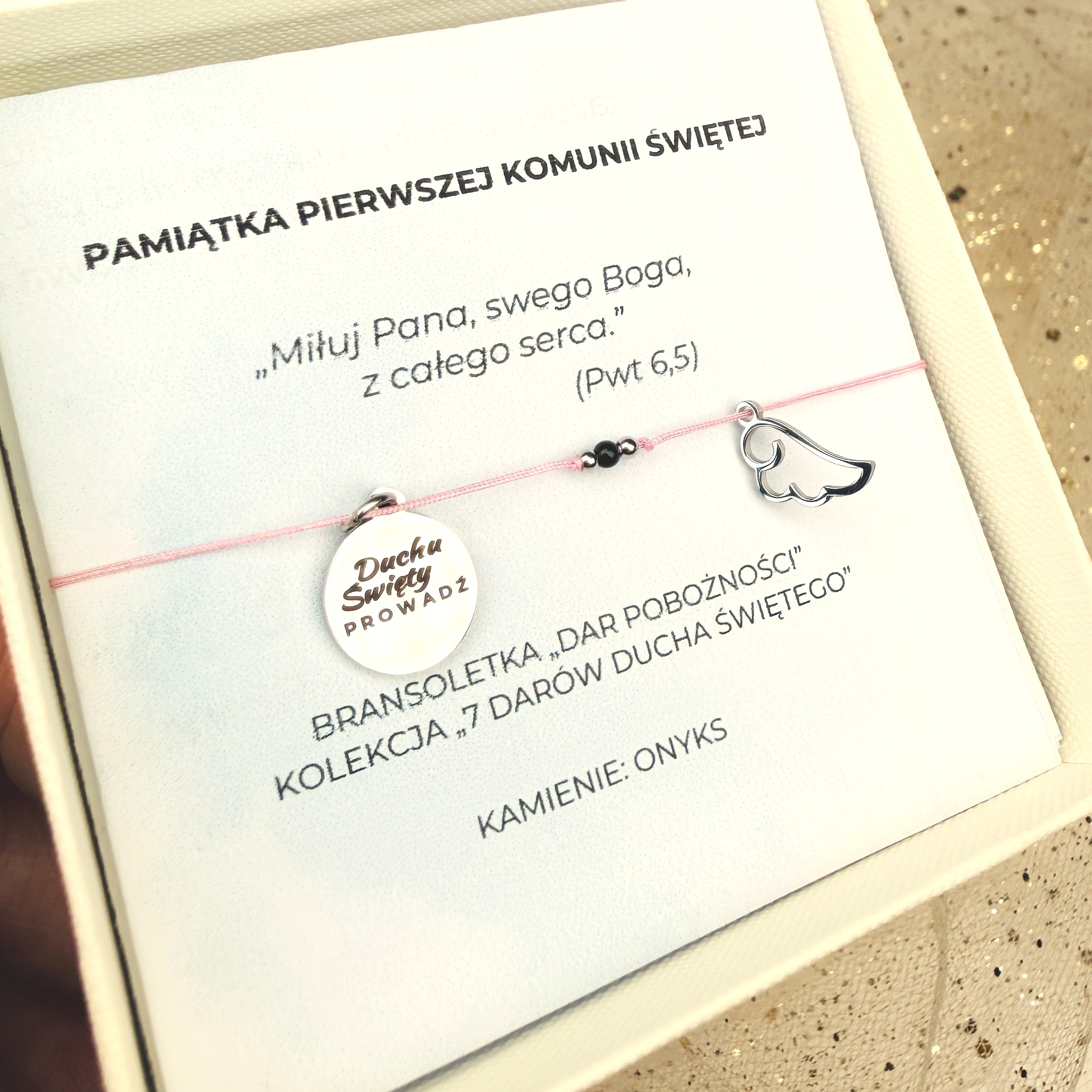 Ta bransoletka komunijna z przesłaniem może towarzyszyć nie tylko w dniu uroczystości, ale również później — w modlitwie, w domu, w szkole i w codziennych chwilach, przypominając, że Bóg jest zawsze blisko.