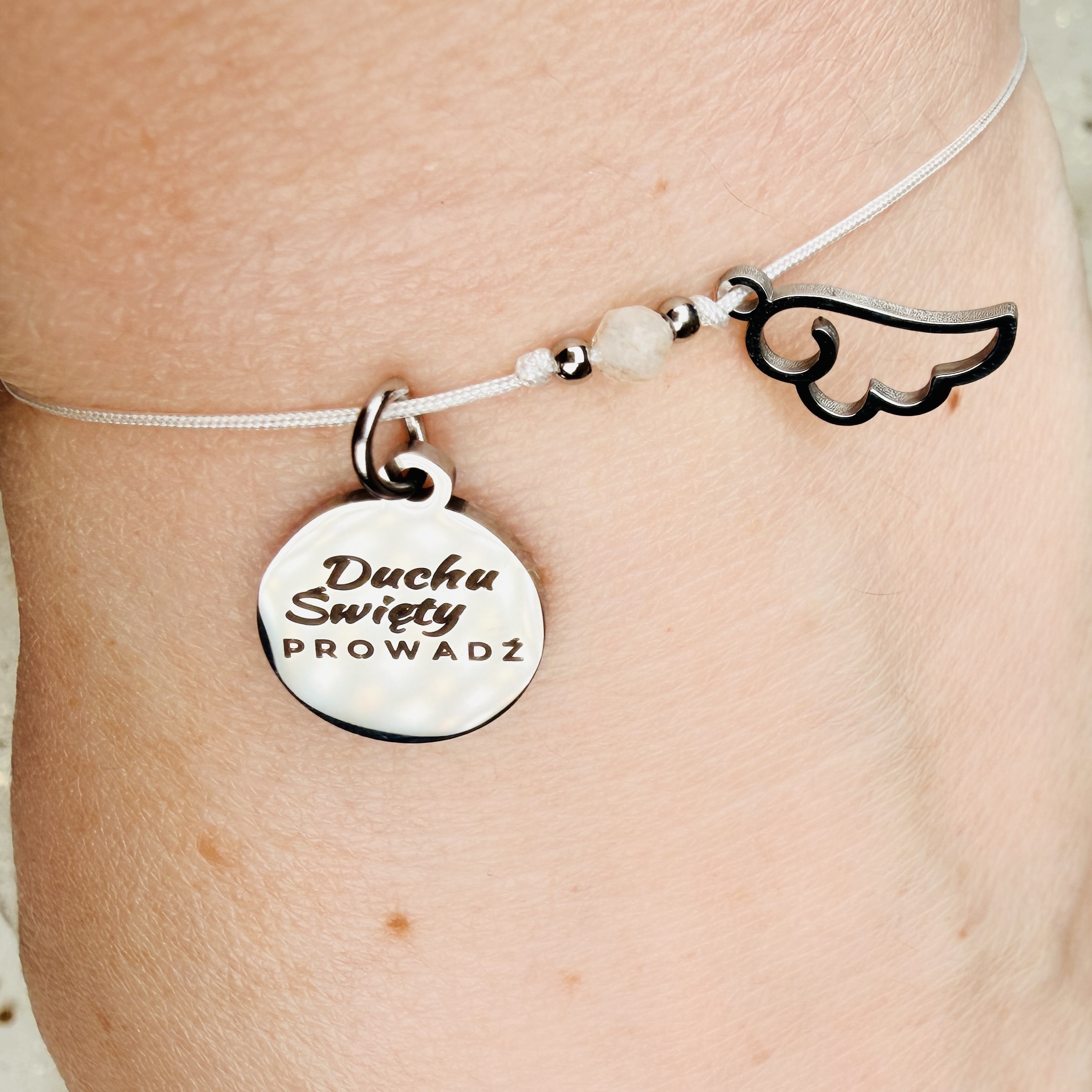 Szczególnym elementem bransoletki jest blaszka z grawerem „Duchu Święty, prowadź” — krótką modlitwą, która pięknie oddaje sens Daru Rozumu i może towarzyszyć dziewczynce każdego dnia.