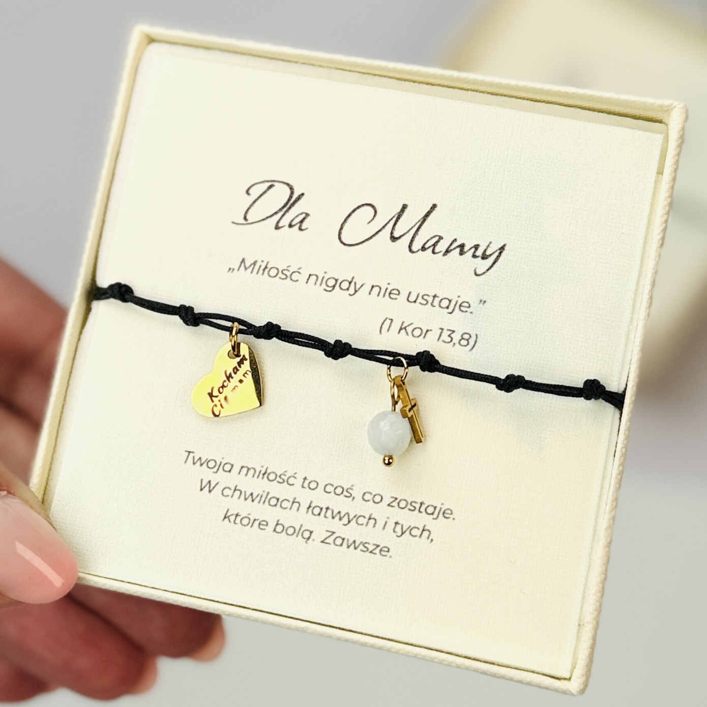 Otrzymasz je w eleganckim pudełeczku z personalizowaną kartką i cytatem biblijnym. Całość zapakowana z troską o każdy szczegół. Możesz także dokupić ozdobną torebkę prezentową za jedyne 5 zł.
