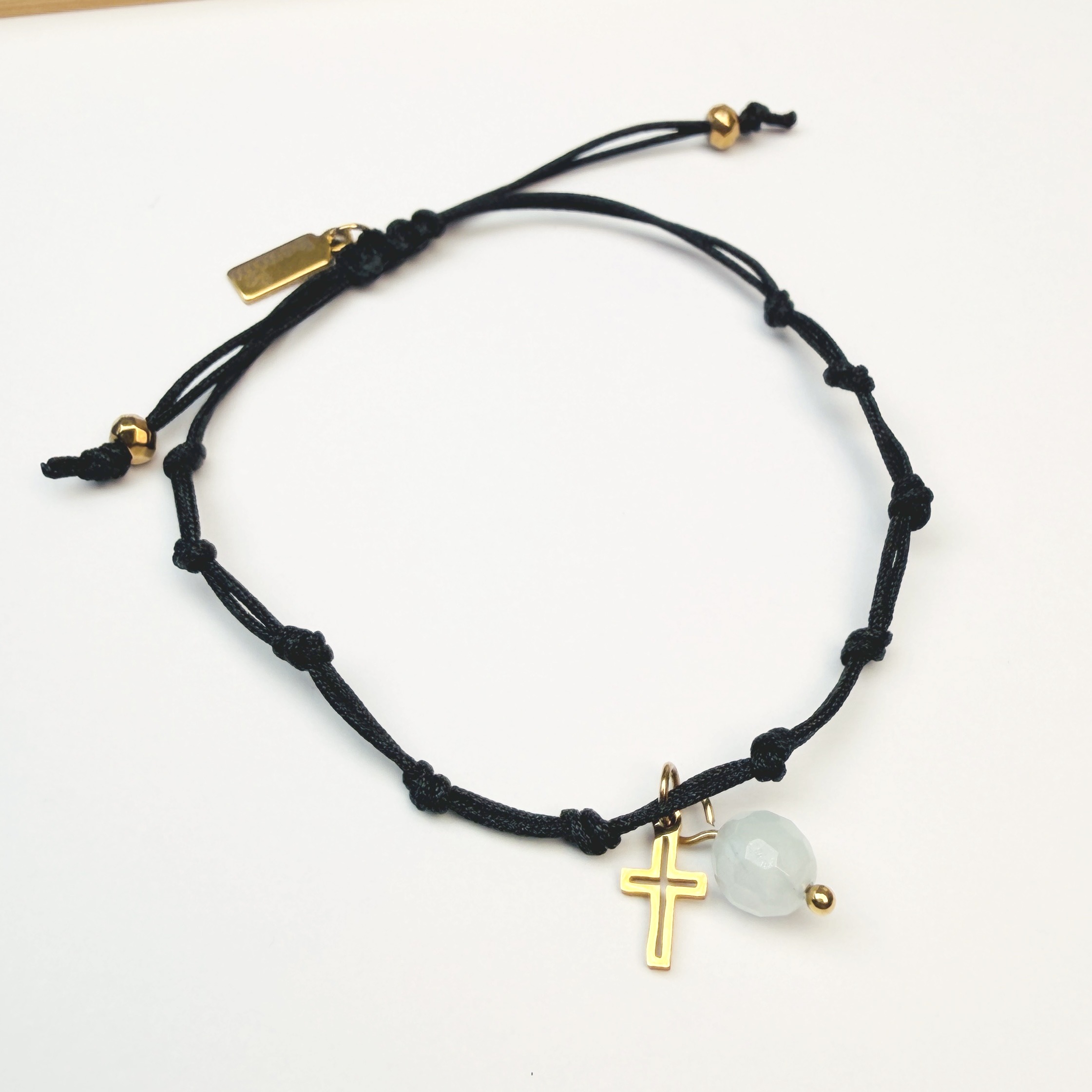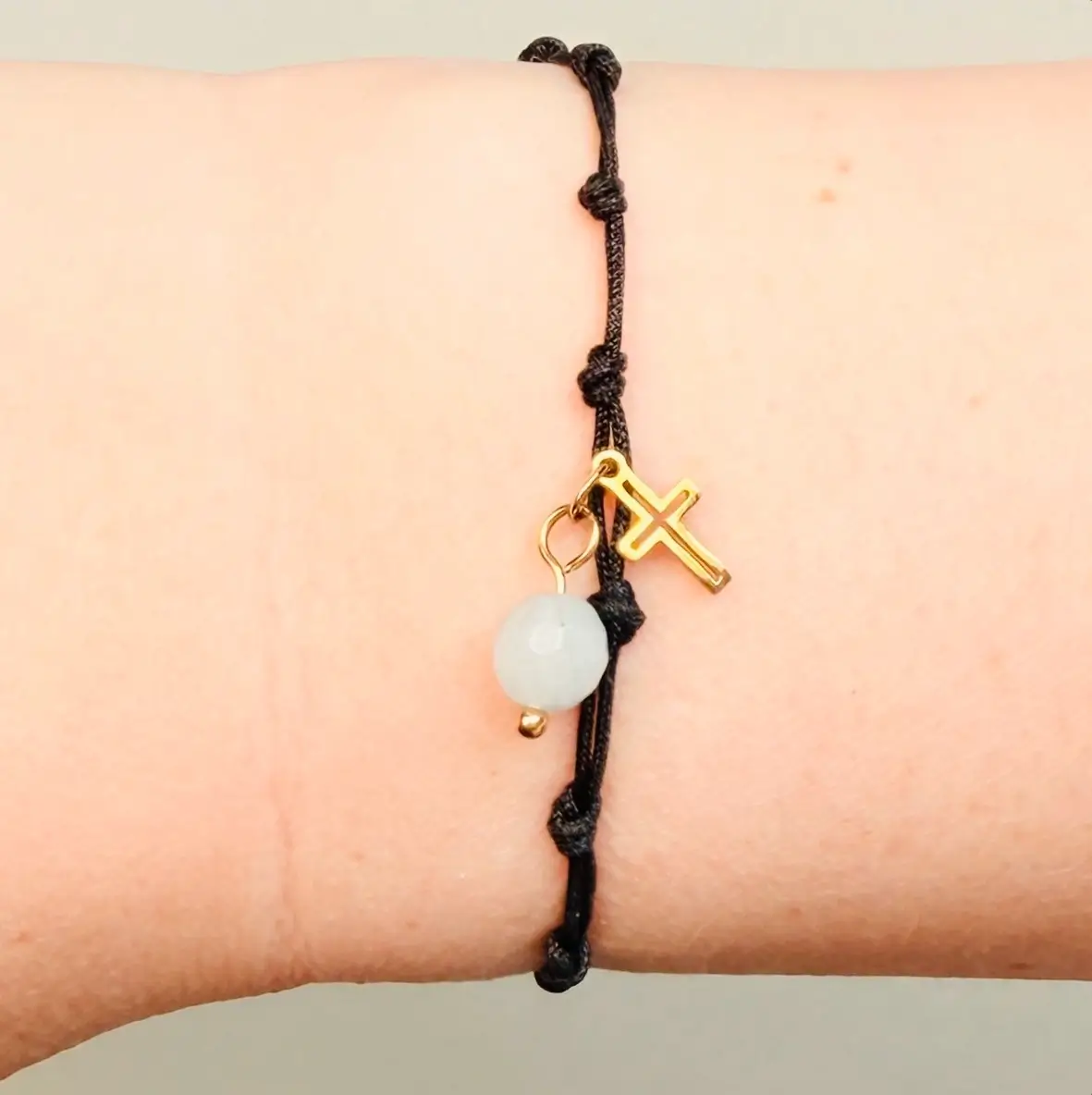 Minimalistyczna forma z supełkami na sznurku pozwala przesuwać paciorki podczas modlitwy w naturalny sposób. Dzięki temu różaniec na rękę damski możesz mieć zawsze przy sobie — w zwyczajnych dniach i w chwilach próby.